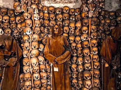 The primary appeal is found in the church’s crypt, where many visitors feel a chill down their spines as soon as they walk down to the ossuary. After they finished the church in 1631, Cardinal Antonio Marcello Barberini, who was a member of the Capuchin friars, ordered that the remains of the members of his order be moved from the cemetery to the church’s crypt. It was instructed that the bones were to be placed on the walls specifically, creating unique designs full of religious symbolism so the space could be a site where the friars would come to reflect and pray. The crypt is divided into six pocket-sized chapels, decorated with the bones of 4,000 Capuchin friars who died between 1528 and 1870.